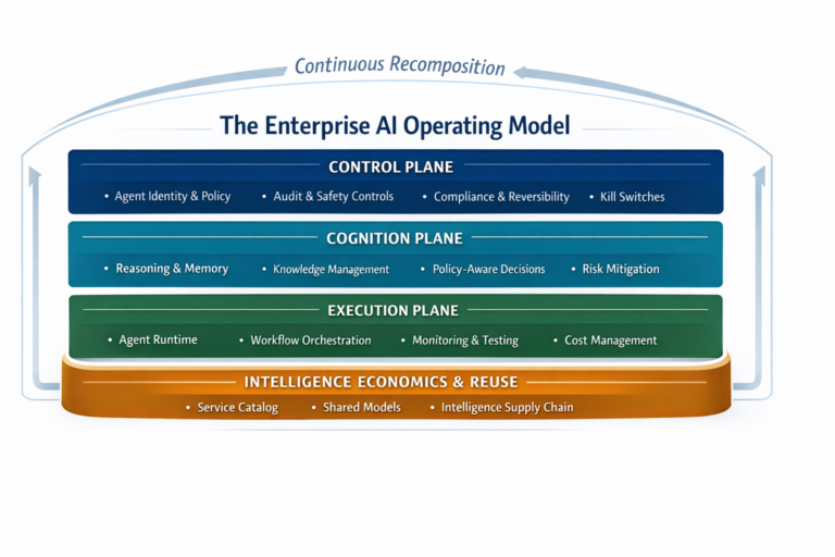 Enterprise AI Operating Model: The structure required to run AI safely at scale across governance, reasoning, runtime, and economics.
